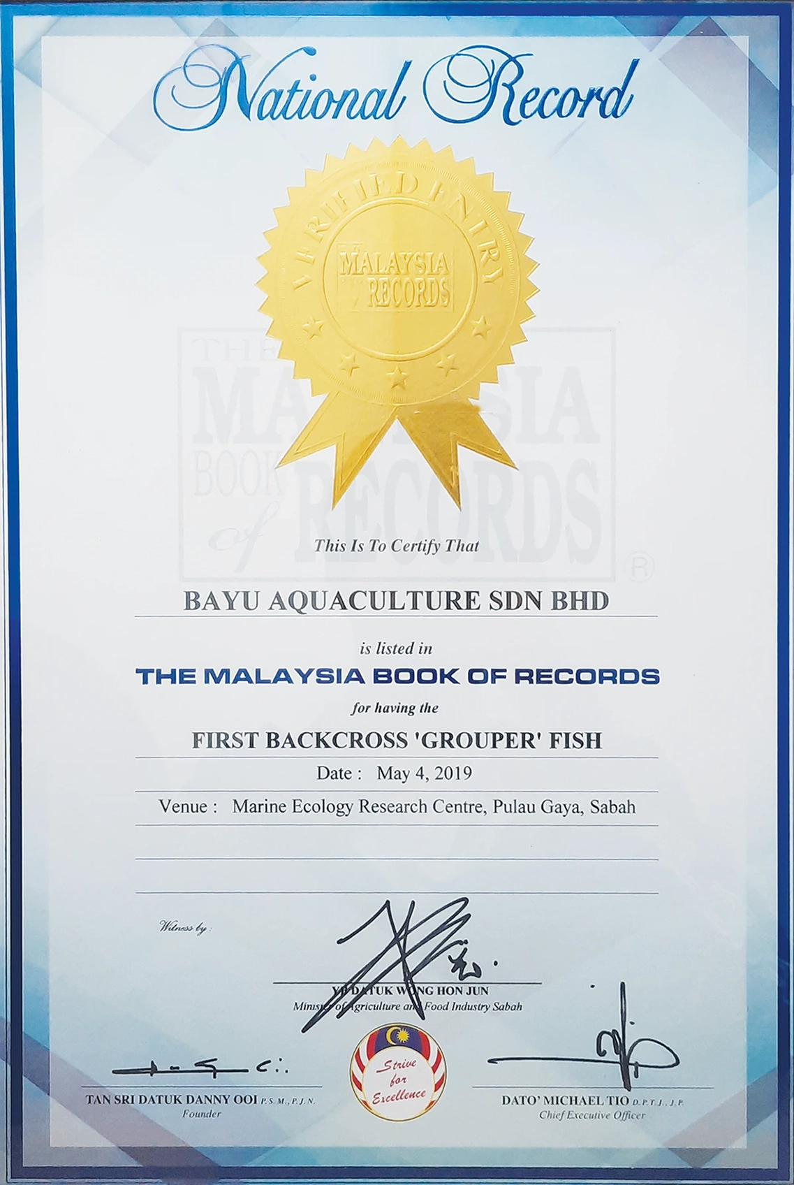 Awarded by Malaysia book of records, for having the first backcross 'Grouper' fish.