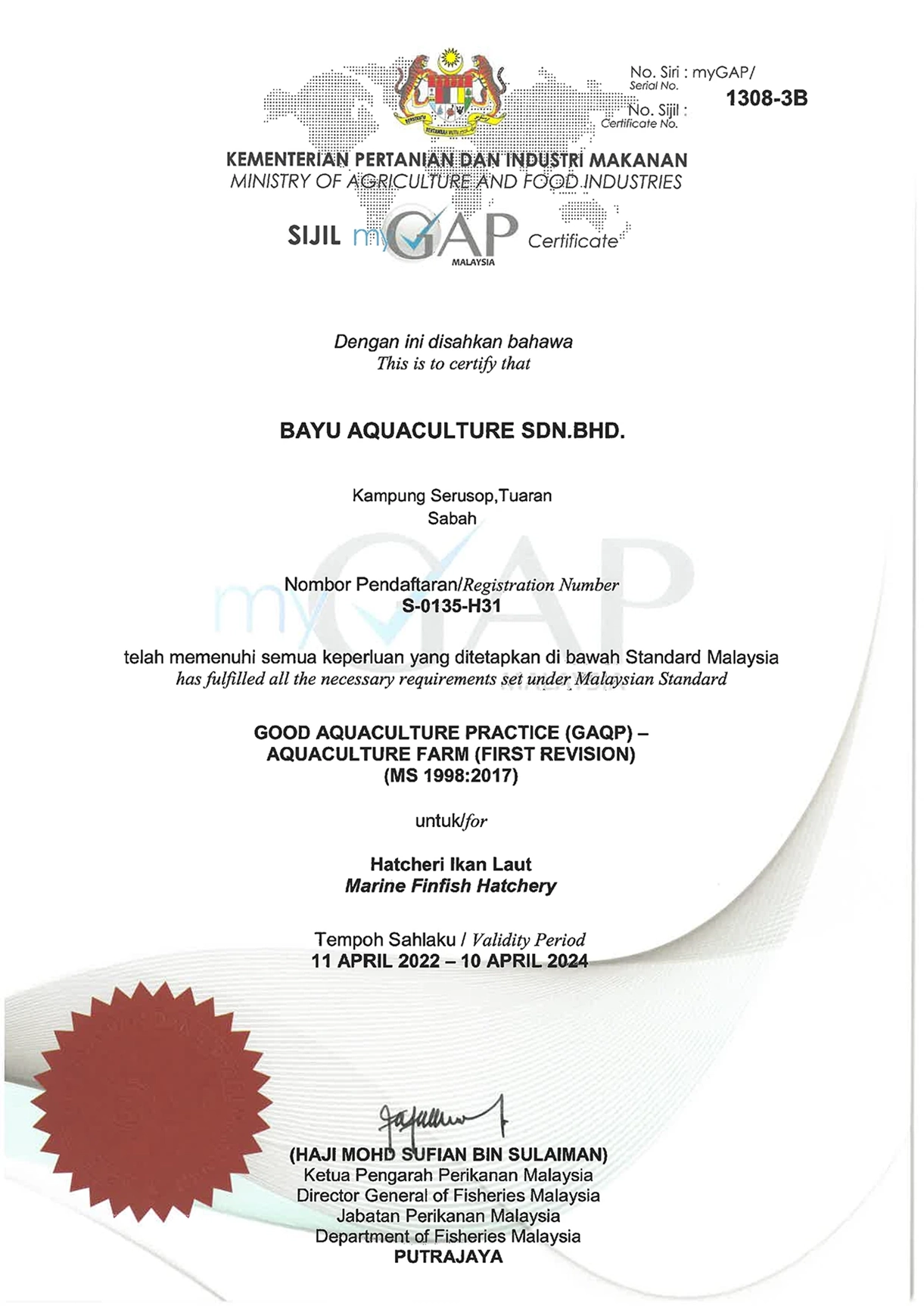 Bayu Aquaculture is MyGAP certified, As we pride ourselves in good aquaculture practices.