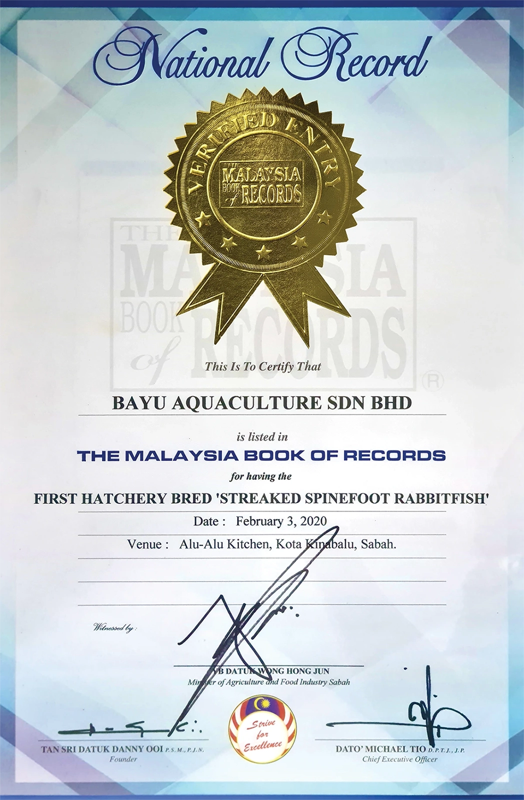 Awarded by Malaysia book of records, for having the first hatchery bred 'Streaked Spinefoot Rabbitfish (Siganus Javus)'.