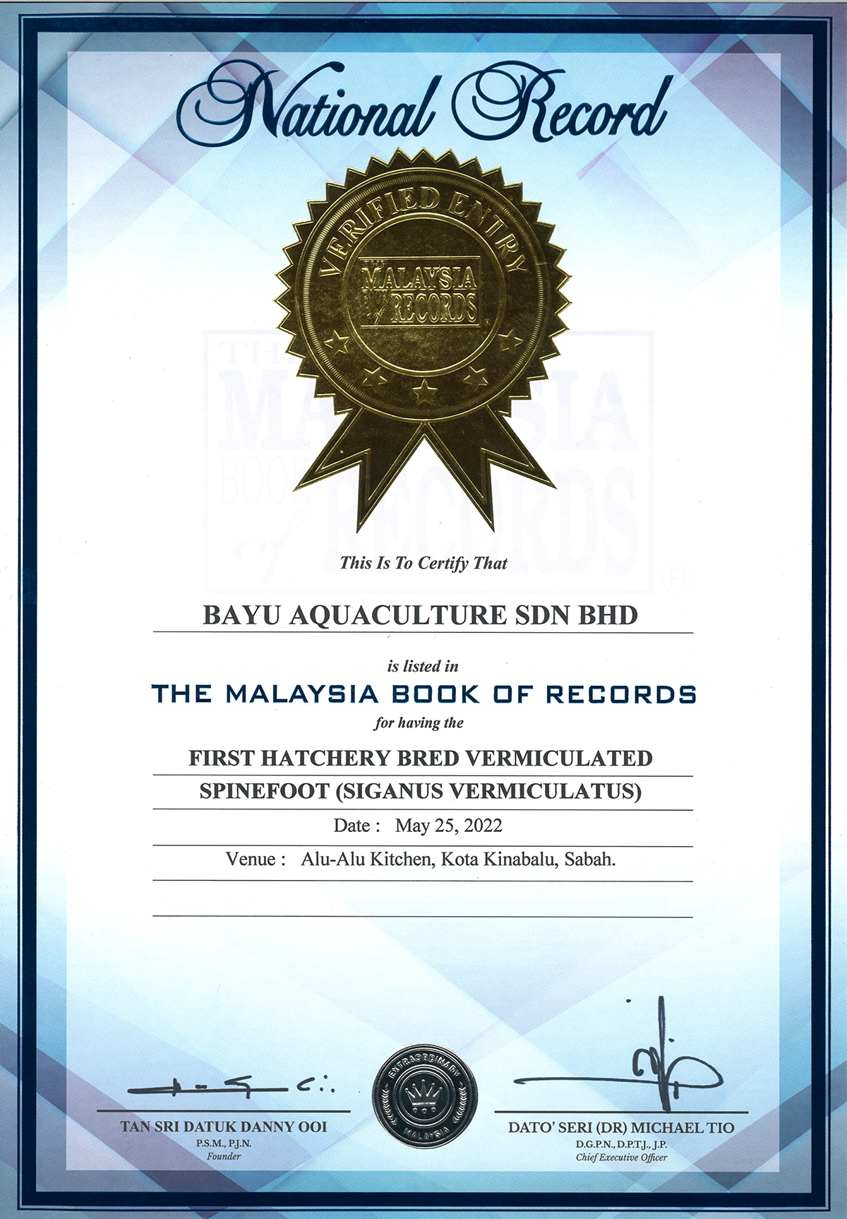 Awarded by Malaysia book of records, for having the first hatchery bred 'Vermiculated Spinefoot (Siganus Vermiculated)'.