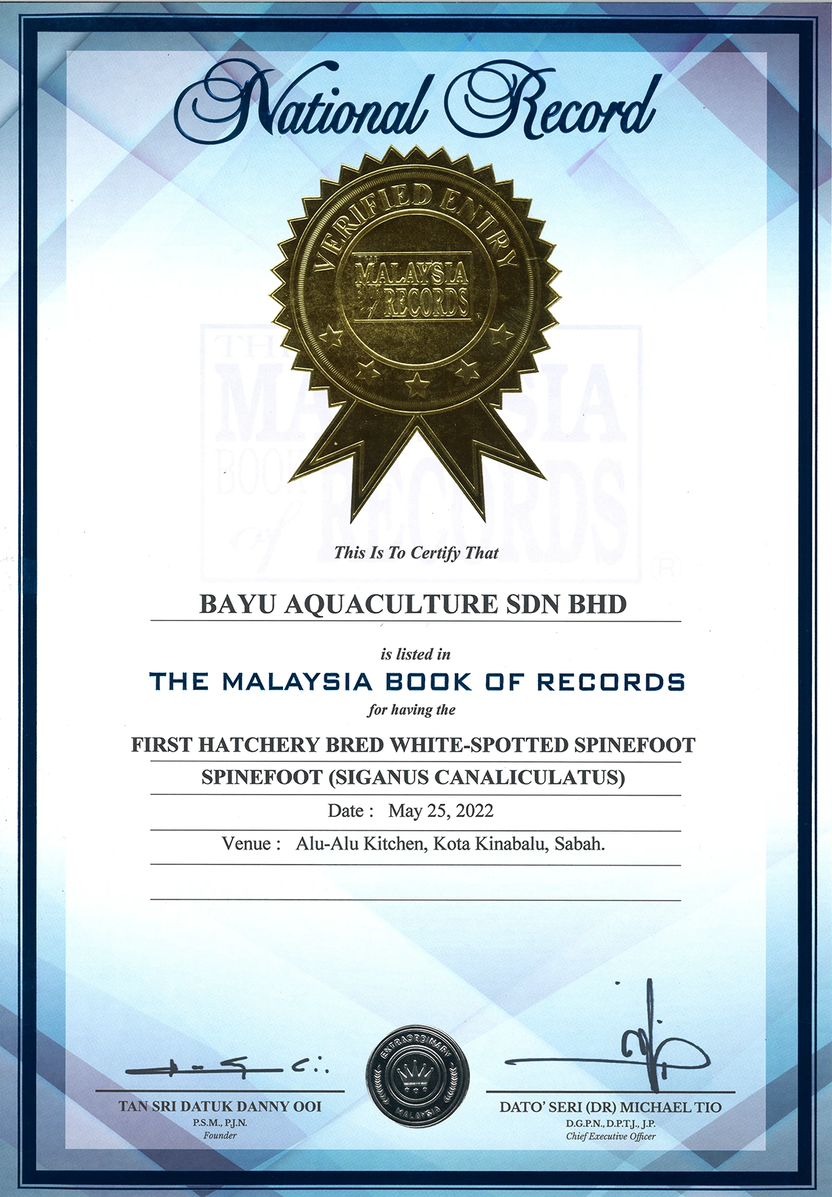 Awarded by Malaysia book of records, for having the first hatchery bred 'White-Spotted Spinefoot (Siganus Canaliculatus)'.