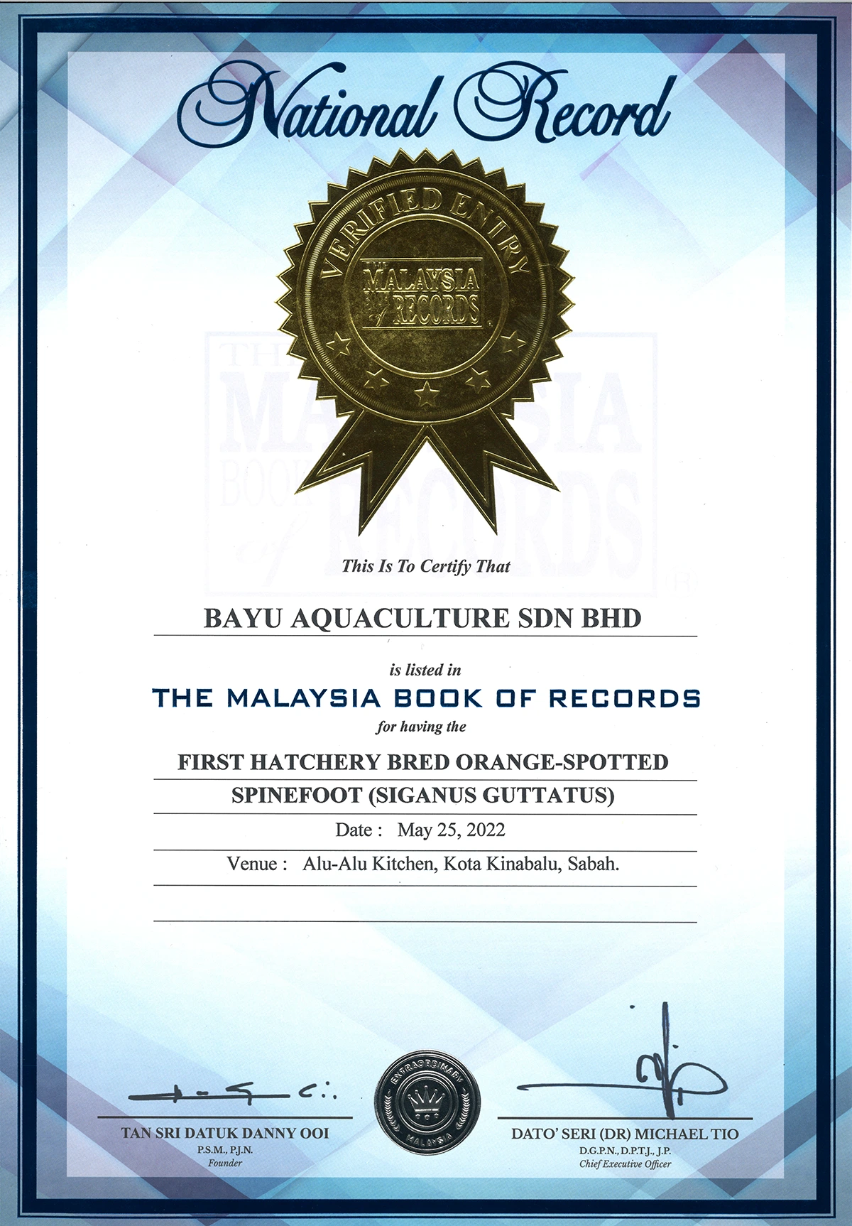 Awarded by Malaysia book of records, for having the first hatchery bred 'Orange-Spotted Spinefoot (Siganus Guttatus)'.